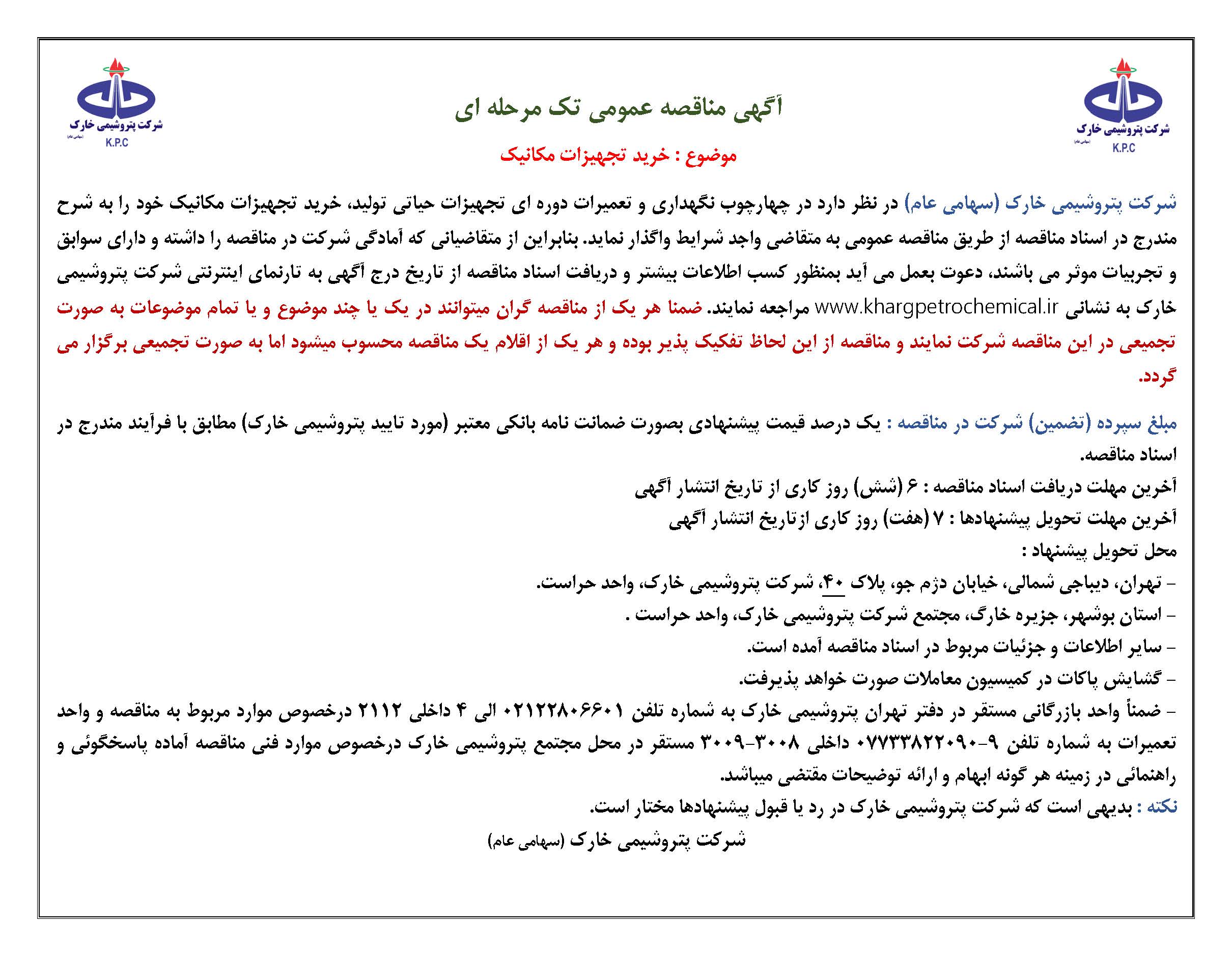 آگهي مناقصه عمومي تك مرحله اي خريد تجهيزات مكانيك و آزمايشگاهي