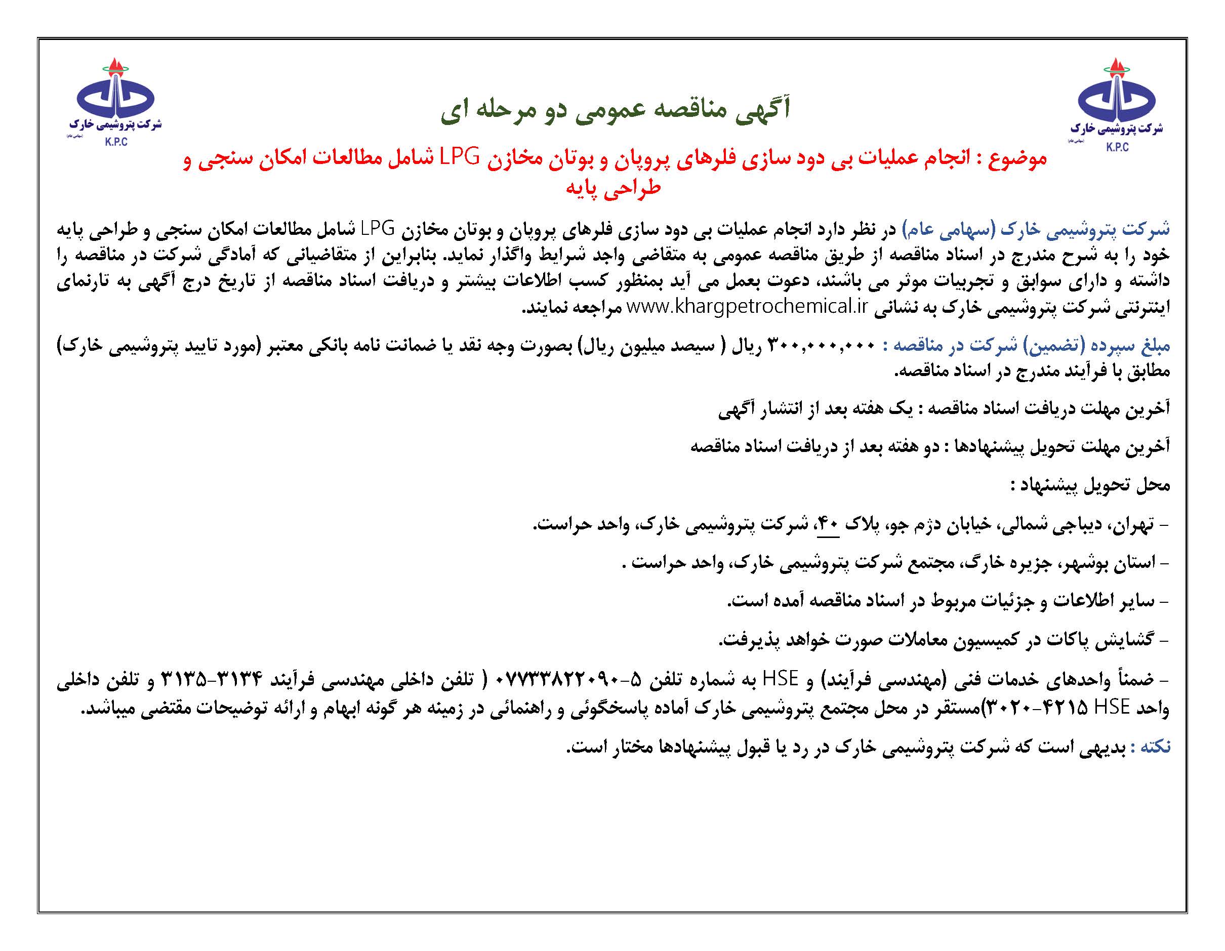 LPG- مناقصه عمومي دو مرحله اي انجام عمليات بي دود سازي فلرهاي پروپان و بوتان مخازن