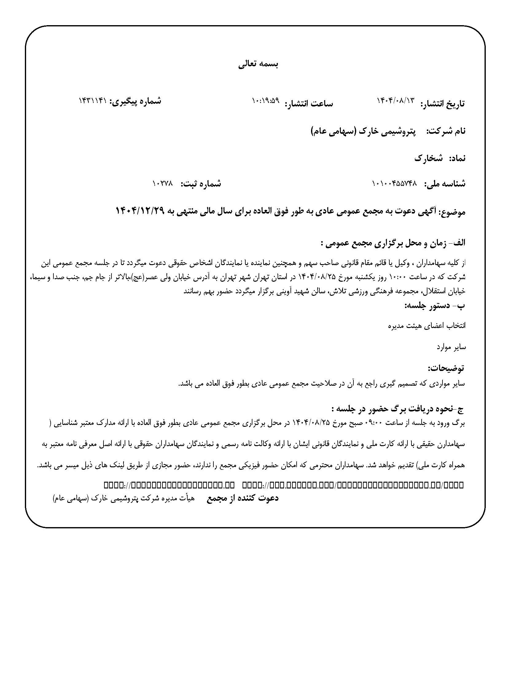 آگهي دعوت به مجمع عمومي عادي بطور فوق العاده صاحبان سهام