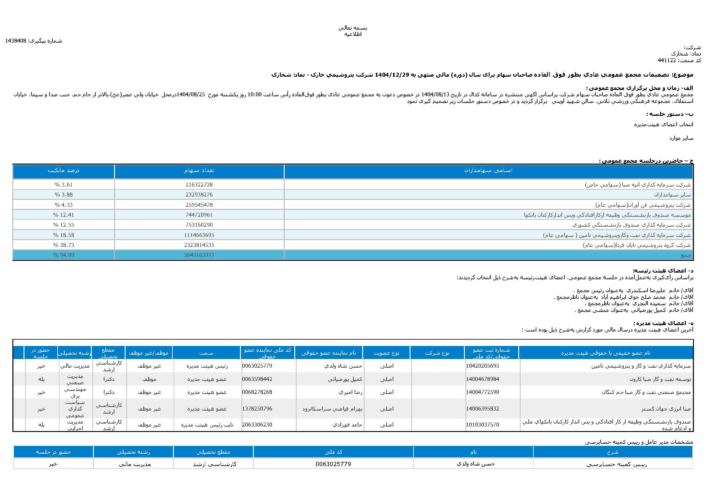 تصمیمات مجمع عمومی عادی به طور فوق العاده دوره ۱۲ ماهه منتهی به 14041229