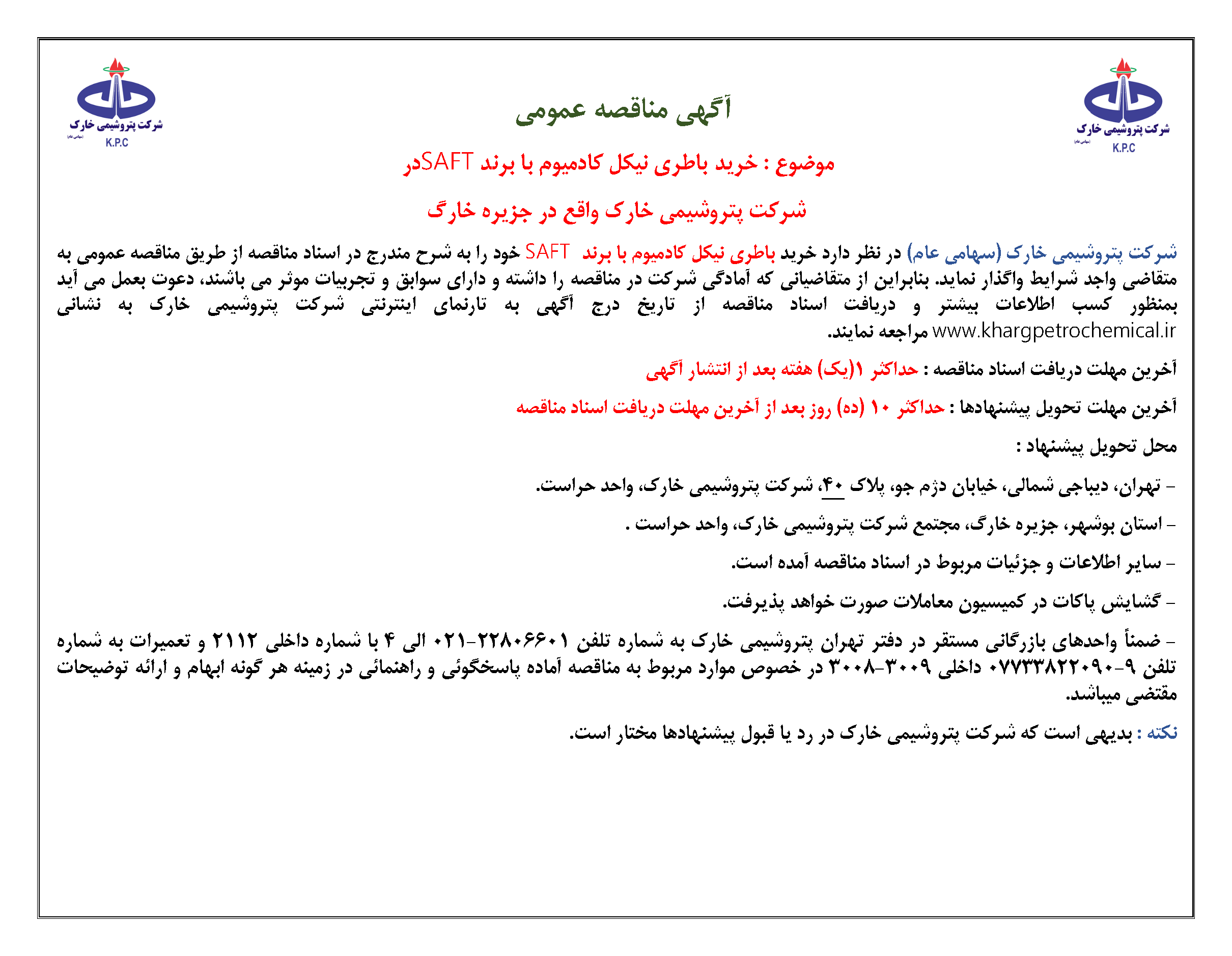 آگهی مناقصه عمومی خريد باطري نيكل كادميوم با برند SAFT