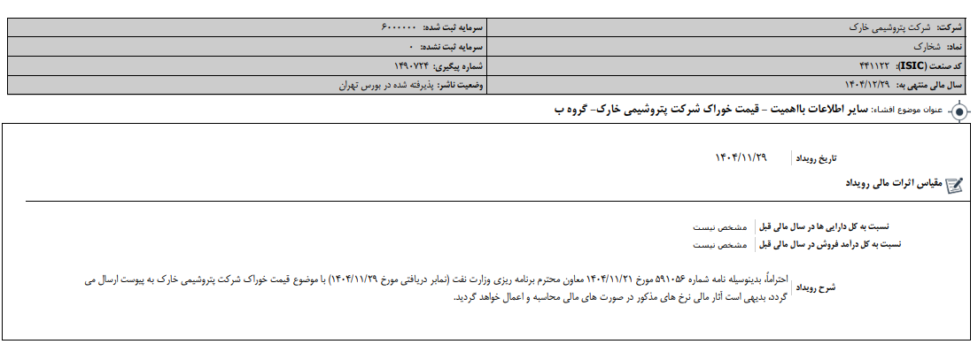 افشای اطلاعات بااهمیت - (سایر اطلاعات بااهمیت - قیمت خوراک شرکت پتروشیمی خارک- گروه ب) منتهی به سال مالی ۱۴۰۴/۱۲/۲۹