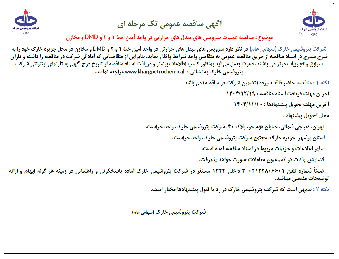 آگهی مناقصه عمومی تك مرحله اي - مناقصه عمليات سرويس هاي مبدل هاي حرارتی در واحد آمين خط 1 و 2 و DMD و مخازن