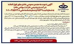 ![]() آگهي دعوت به مجمع عمومي عادي بطور فوق العاده شركت پتروشيمي خارگ(سهامي عام) آگهي دعوت به مجمع عمومي عادي بطور فوق العاده شركت پتروشيمي خارگ(سهامي عام) آگهي دعوت به مجمع عمومي عادي بطور فوق العاده شركت پتروشيمي خارگ(سهامي عام) | |