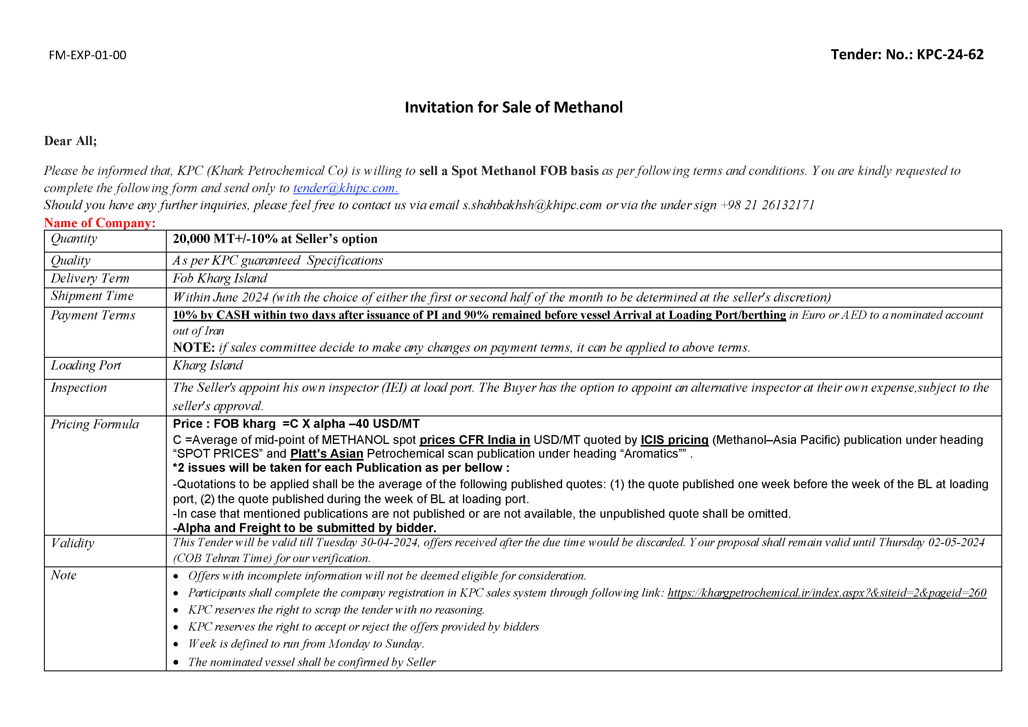 Please be informed that, KPC (Khark Petrochemical Co) is willing to sell a Spot Methanol FOB basis as per following terms and conditions. You are kindly requested to complete the following form and send only to tender@khipc.com.