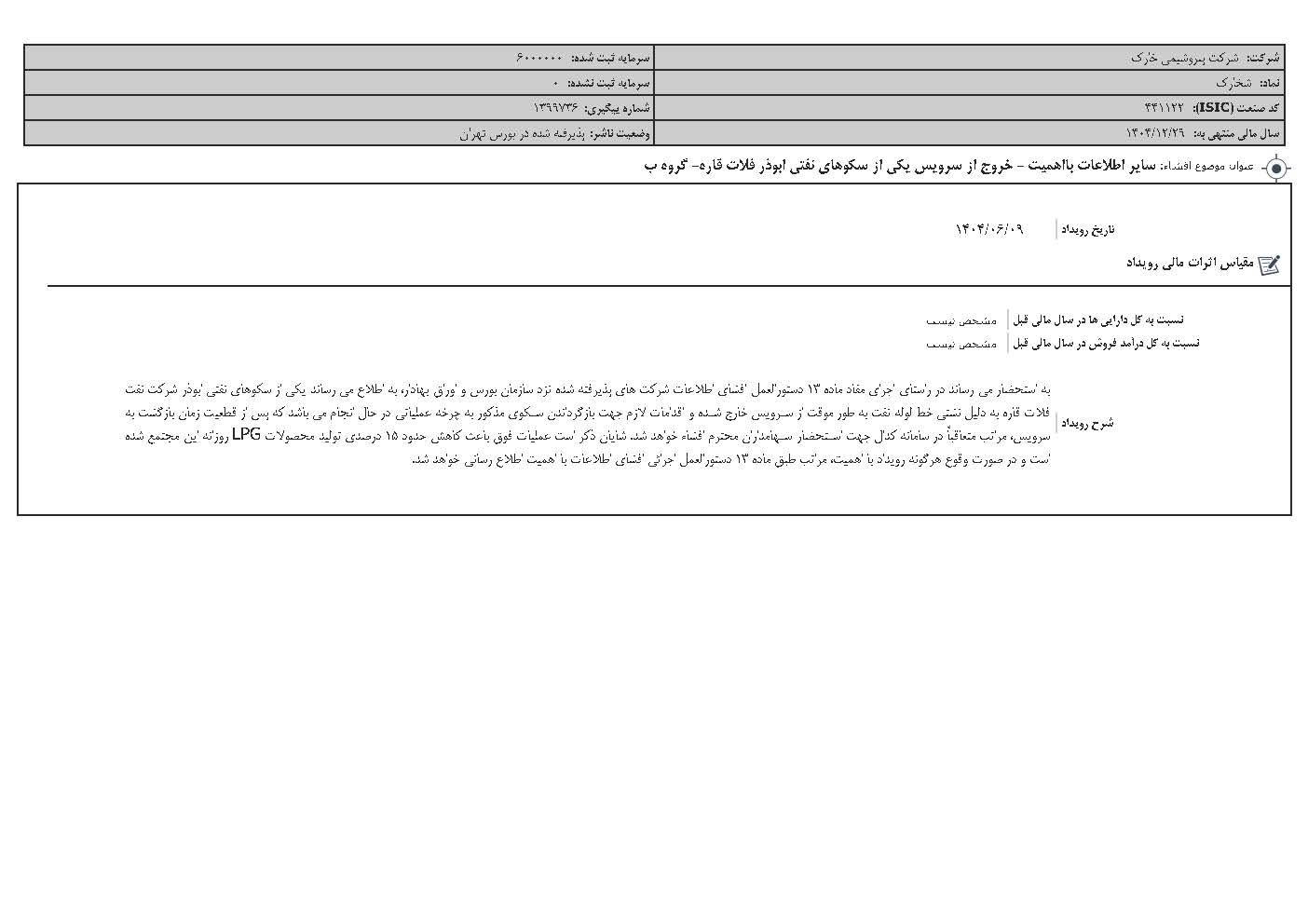 افشای اطلاعات بااهمیت - (سایر اطلاعات بااهمیت - خروج از سرویس یکی از سکوهای نفتی ابوذر فلات قاره- گروه ب) منتهی به سال مالی 14041229
