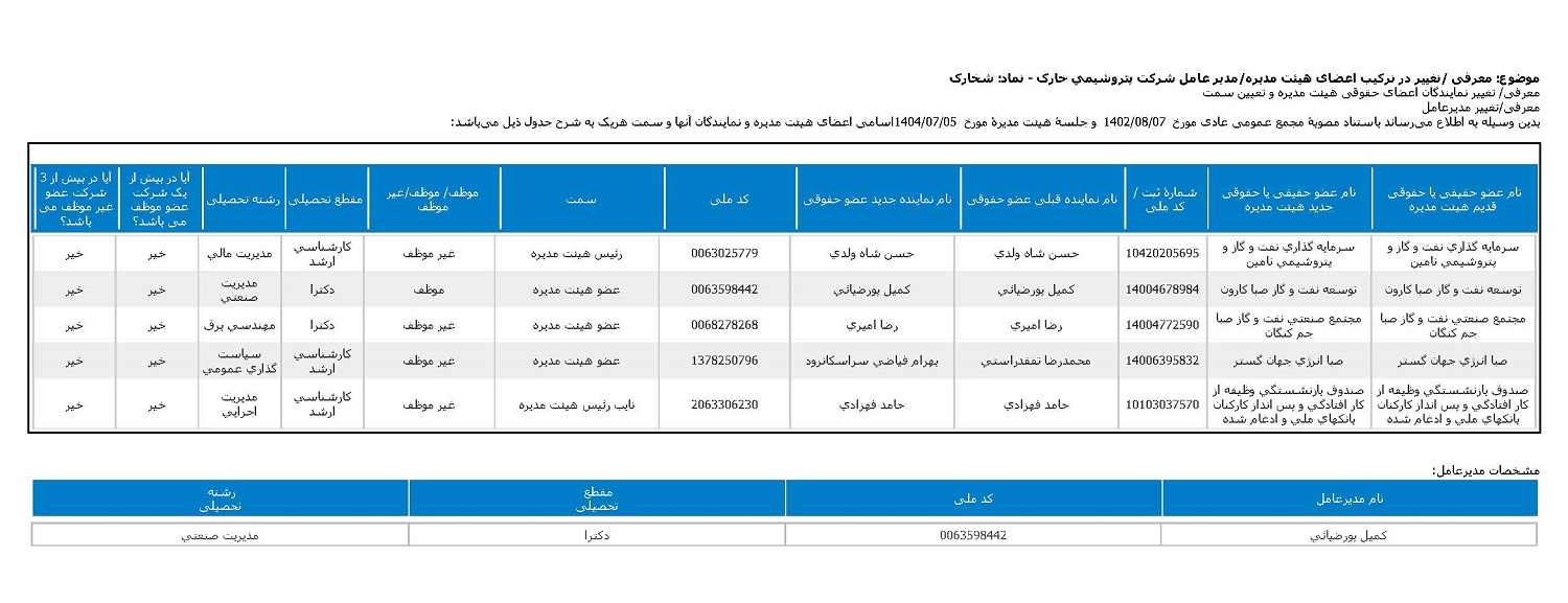 معرفی/ تغییر در ترکیب اعضای هیئت مدیره/مدیر عامل