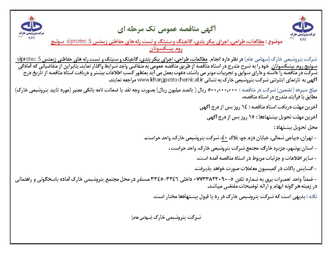 آگهی مناقصه عمومی مطالعات، طراحي، اجراي پيكر بندي، گانفينگ و ستينگ و تست رله هاي حفاطتي زيمنس siprotec 5 سوئيچ روم پيشكسوتان