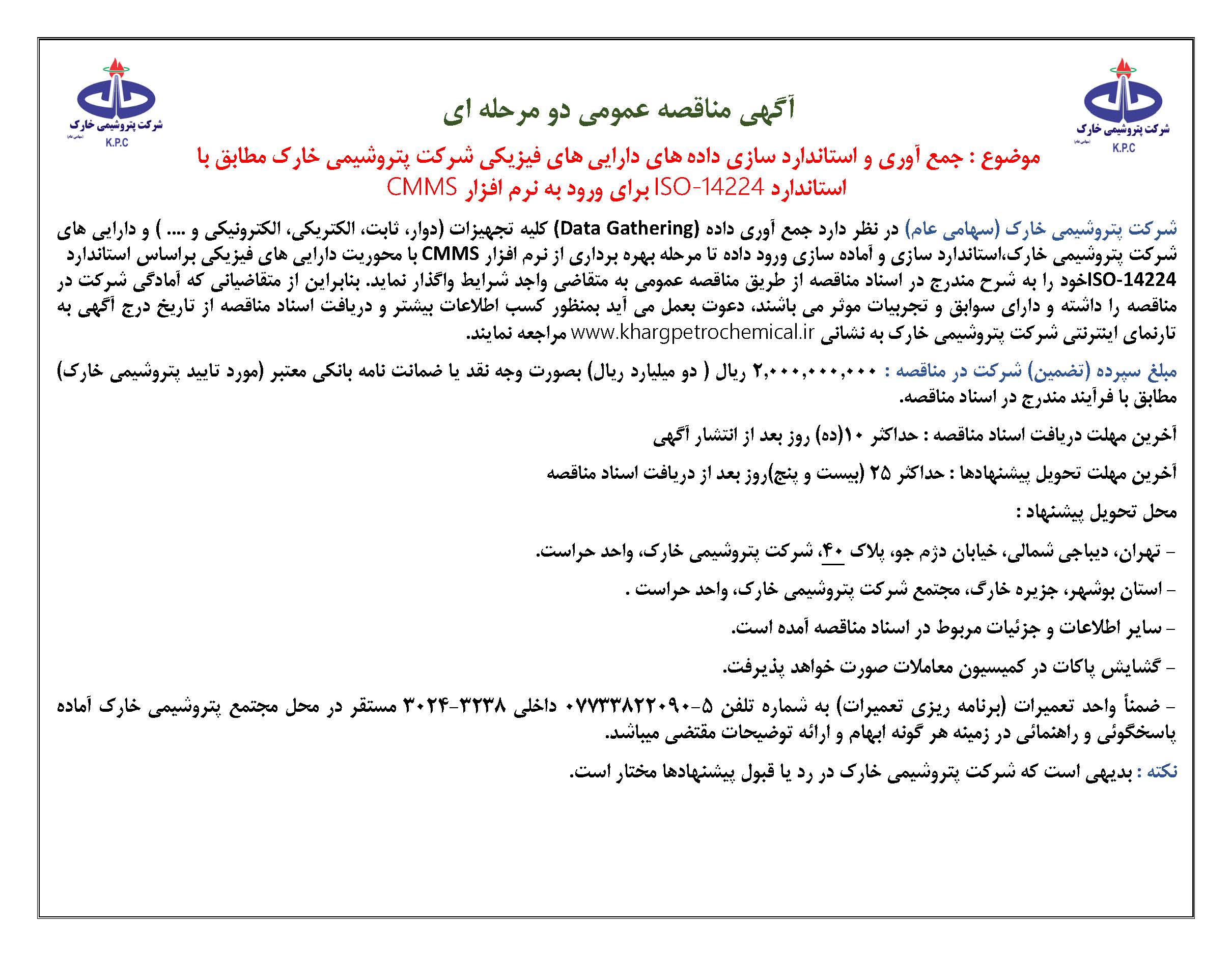 جمع آوري و استاندارد سازي داده هاي دارايی هاي فيزيكی شركت پتروشيمی خارك مطابق با استاندارد ISO-14224 براي ورود به نرم افزار CMMS