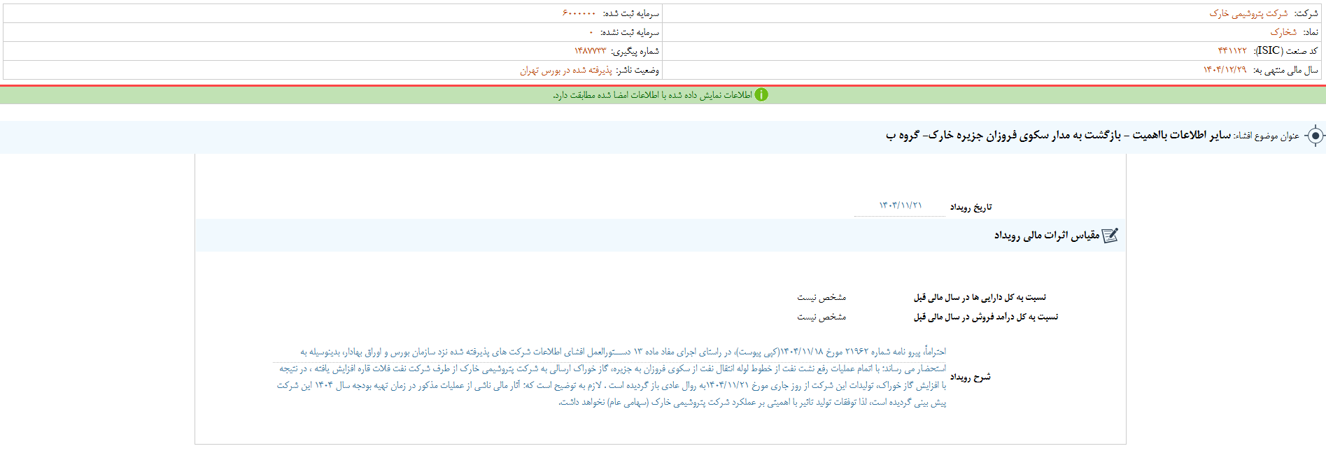 افشای اطلاعات بااهمیت - (سایر اطلاعات بااهمیت - بازگشت به مدار سکوی فروزان جزیره خارک- گروه ب) منتهی به سال مالی ۱۴۰۴/۱۲/۲۹